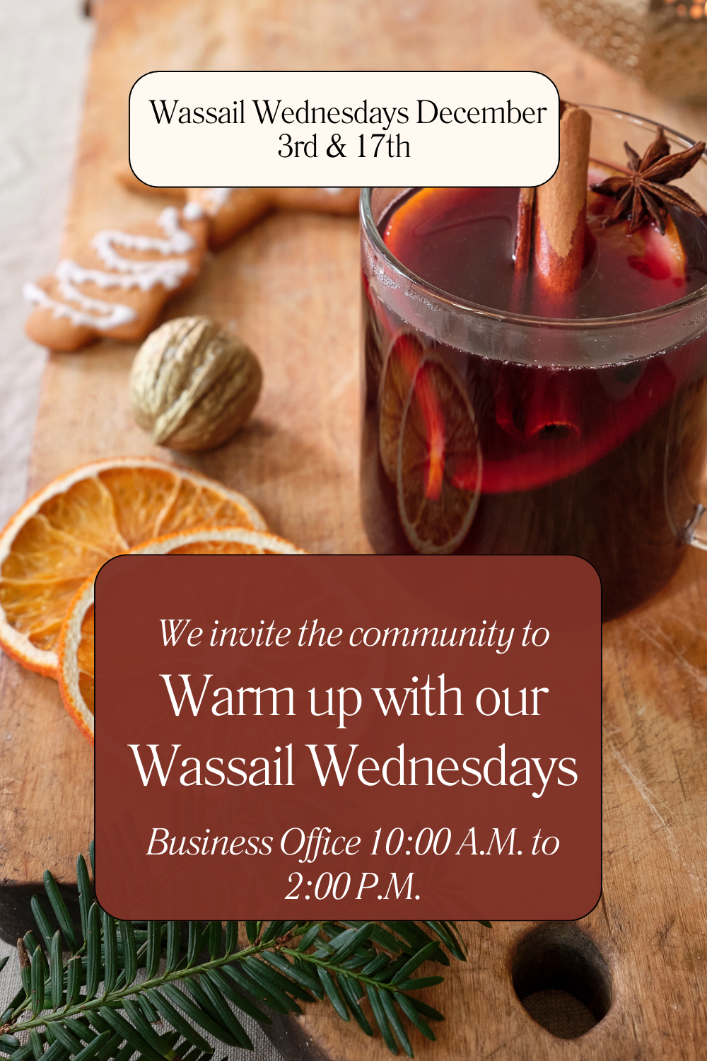 Join us for Wassail Wednesday on December 3 & 17, from 10 AM–2 PM in the Business Office. Cookies and wassail provided—come share some seasonal cheer!